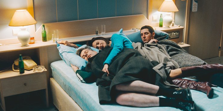 Quatrième attraction : Maria va voir défiler dans sa chambre – qui a certains moments va ressembler à la cabine des Marx Brothers dans Une nuit à l’Opéra (autre clin d’œil cinéphilique) – pour lui demander des comptes, son mari de vingt ans plus jeune (Vincent Lacoste), la prof de piano amante du jeune homme avant leur mariage (Camille Cottin), et une espèce de vieux beau à l’allure d’un imitateur d’Aznavour qui est censé incarner sa volonté (j’avoue n’avoir pas bien compris la symbolique du personnage), et bien sûr toute la galerie de ses jeunes amants plus exotiques les uns que les autres (elle s’envoie en l’air avec des garçons qui ont la moitié de son âge, pour continuer dans le contre-stéréotype).