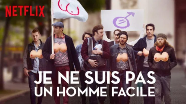 Il est remarquable que le premier film français financé et diffusé par Netflix soit une comédie résolument féministe, sur un argument qui n’est pas neuf mais qui est assez joliment développé ici : Damien, un don juan macho et suffisant (Vincent Elbaz), cadre dans la pub, se cogne à un réverbère en matant une femme et tombe dans les pommes : il se réveille dans un monde « inversé » où règne la domination féminine : dans sa boîte de pub, ce sont les hommes qui sont secrétaires et font le café, et son projet d’application « le gourdinomètre » censé permettre aux hommes de mesurer leurs performances sexuelles, que tous ses collègues masculins trouvaient génial, est refusé pour cause de ringardise par la nouvelle directrice qui n’est autre que la seule femme de leur comité de direction qu’ils accablaient de leurs blagues machistes… Désormais, il doit faire ses preuves, et se fera d’ailleurs bientôt virer…