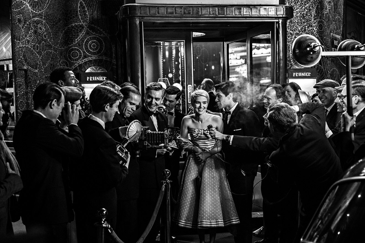 Nouvelle Vague déploie des moyens et des talents impressionnants pour reconstituer le tournage d’À bout de souffle dans le Paris de l’été 1959, alors que Les 400 coups de Truffaut vient de triompher au Festival de Cannes, et que Chabrol a déjà sorti deux films. Reprenant le noir et blanc typique des films de la Nouvelle Vague (la couleur était déjà utilisée en France par des coproductions à gros budget), le film de Linklater choisit de faire incarner les protagonistes de cette histoire par des acteurs inconnus qui cumulent une ressemblance physique souvent impressionnante avec leur modèle et un jeu qui crée une illusion presque parfaite : ce choix inverse de celui de la plupart des biopics qui cherchent à faire ressembler des acteurices connu·es à leur modèle à force de maquillage et de postiches (dernier exemple en date : Toi qui m’aimais de Diane Kurys, avec Marina Foïs et Roschdy Zem incarnant Signoret et Montand) – se révèle tout à fait convaincant.