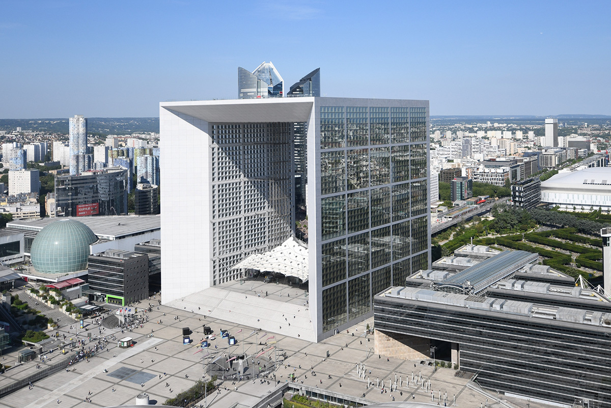 L’accès au toit a été fermé, rendu à nouveau possible en 2017, fermé à nouveau depuis 2023 [11]. Pour le pilier nord, les propriétaires (AXA et la Caisse des dépôts) rechignent à s’y mettre, proposant de remplacer les plaques de marbre défectueuses par de la tôle blanche laquée [12] , revenant plus tard à un meilleur choix. L’ascenseur qui permet au public de monter sur le toit – vue imprenable sur Paris – est trop petit pour satisfaire les besoins, et les ascensoristes ne veulent pas s’impliquer dans une rénovation. Les « nuages » de verre que Spreck imaginait sous l’Arche et sur ses côtés sont en partie remplacés par des structure de grosse toile. La grande peinture colorée… est invisible de l’extérieur ! Quant aux petits cubes blancs qui devaient entourer l’Arche, ils disparaissent du projet, pour des raisons financières et techniques, au profit d’immeubles de bureau.