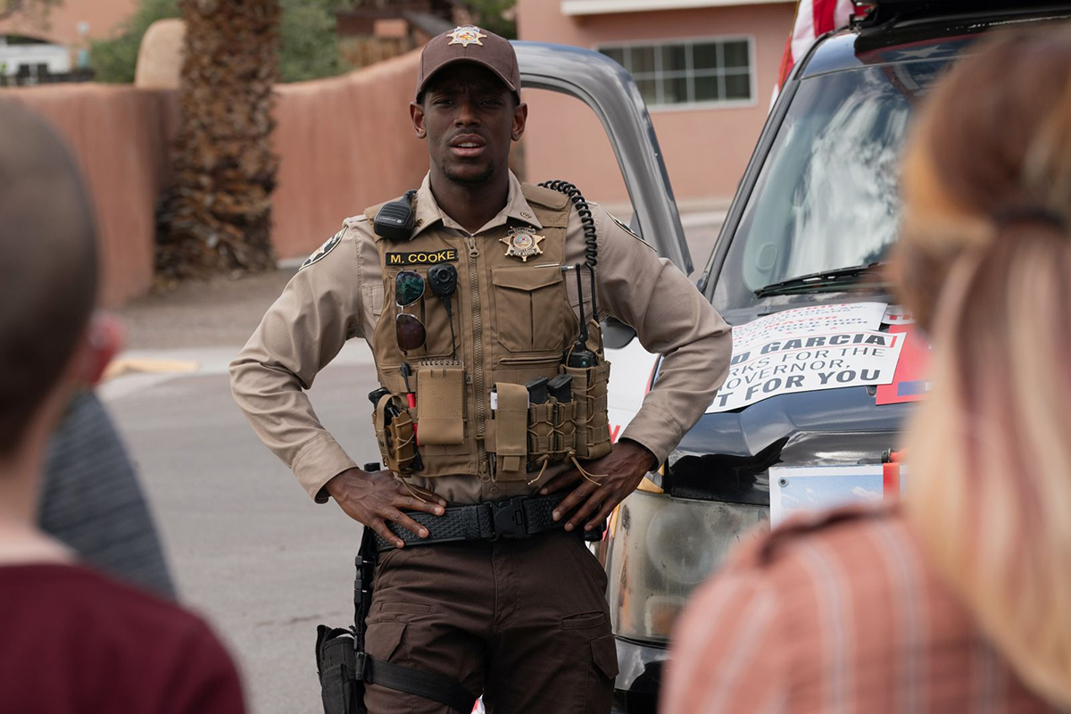 La fuite en avant du shérif prend des allures de western dans les paysages désertiques du Nouveau Mexique mais plonge peu à peu dans la plus grande confusion : on voit arriver une milice privée anonyme par avion qui semble émaner du Klu-Klux Klan (on voit une croix en flammes dans la nuit qui tombe) mais qui pourchasse le shérif après avoir attaqué l’Afro-Américain, jusqu’à une séquence insupportable où le shérif s’empare d’armes de guerre pour tirer interminablement sur tout ce qui bouge (ce qui met la patience des spectateurices à rude épreuve). Il sera finalement neutralisé et transformé en zombie à son tour dans un épilogue surréaliste où le data center est inauguré par la belle-mère devenue la porte-parole du shérif paraplégique et de l’Amérindien tout aussi muet.