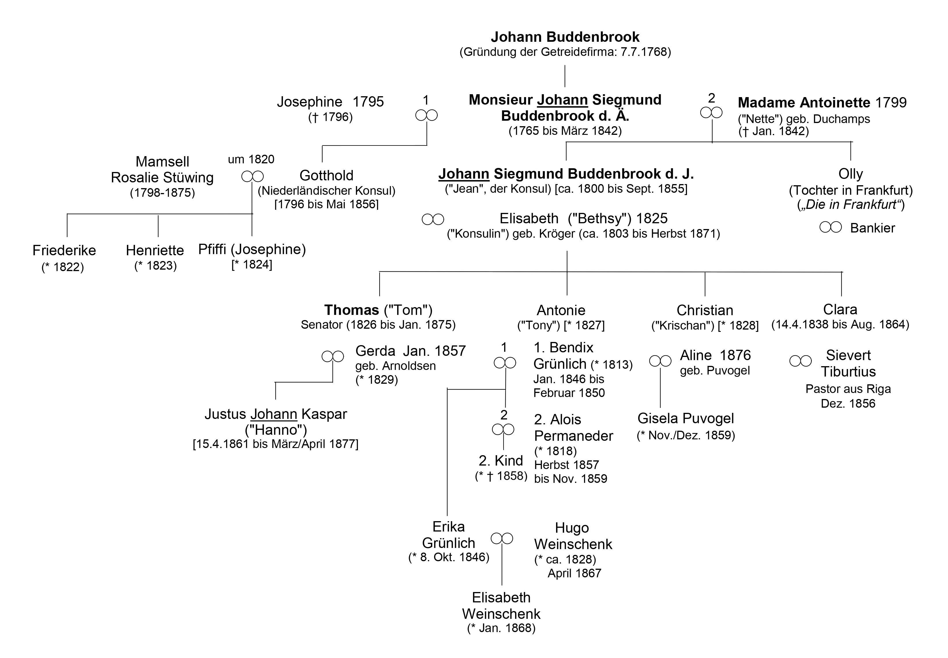 Tony finit par accepter, la mort dans l’âme, de se soumettre aux vœux de son père, puisqu’il le faut, prise dans les rets de la généalogie : obéissance, respectabilité, assurance d’un train de vie « distingué » [5], inscription dans le temps long. Patatras : Bendix néglige Tony, fait de mauvaises affaires, compte sur l’héritage futur de sa belle. Tony se réfugie à Lübeck, c’est la honte : « une femme divorcée » ! Dont le mari a éclusé la confortable dot de 80 000 thalers. Tony ne prononcera plus jamais le nom de Bendix…